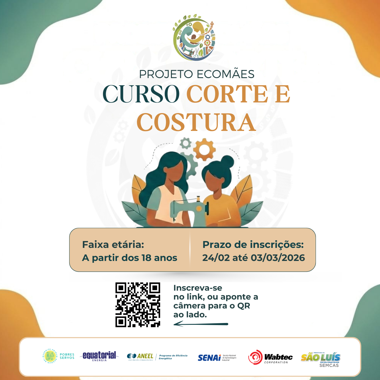 O Projeto EcoMães está com inscrições abertas para o curso gratuito de corte e costura, destinado a mulheres a partir de 18 anos. As inscrições acontecem de 24/02/2026 a 03/03/2026 e podem ser realizadas pelo link na bio ou pelo QR Code disponível na imagem.